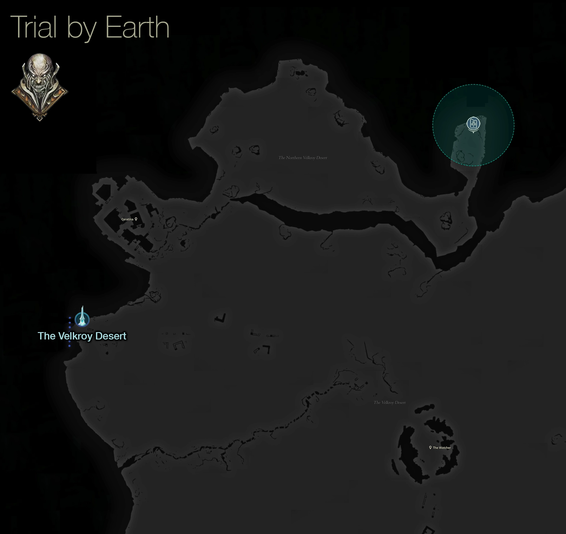 Map showing the location of the Trial by Earth in the Velkroy Desert in Dhalmekia