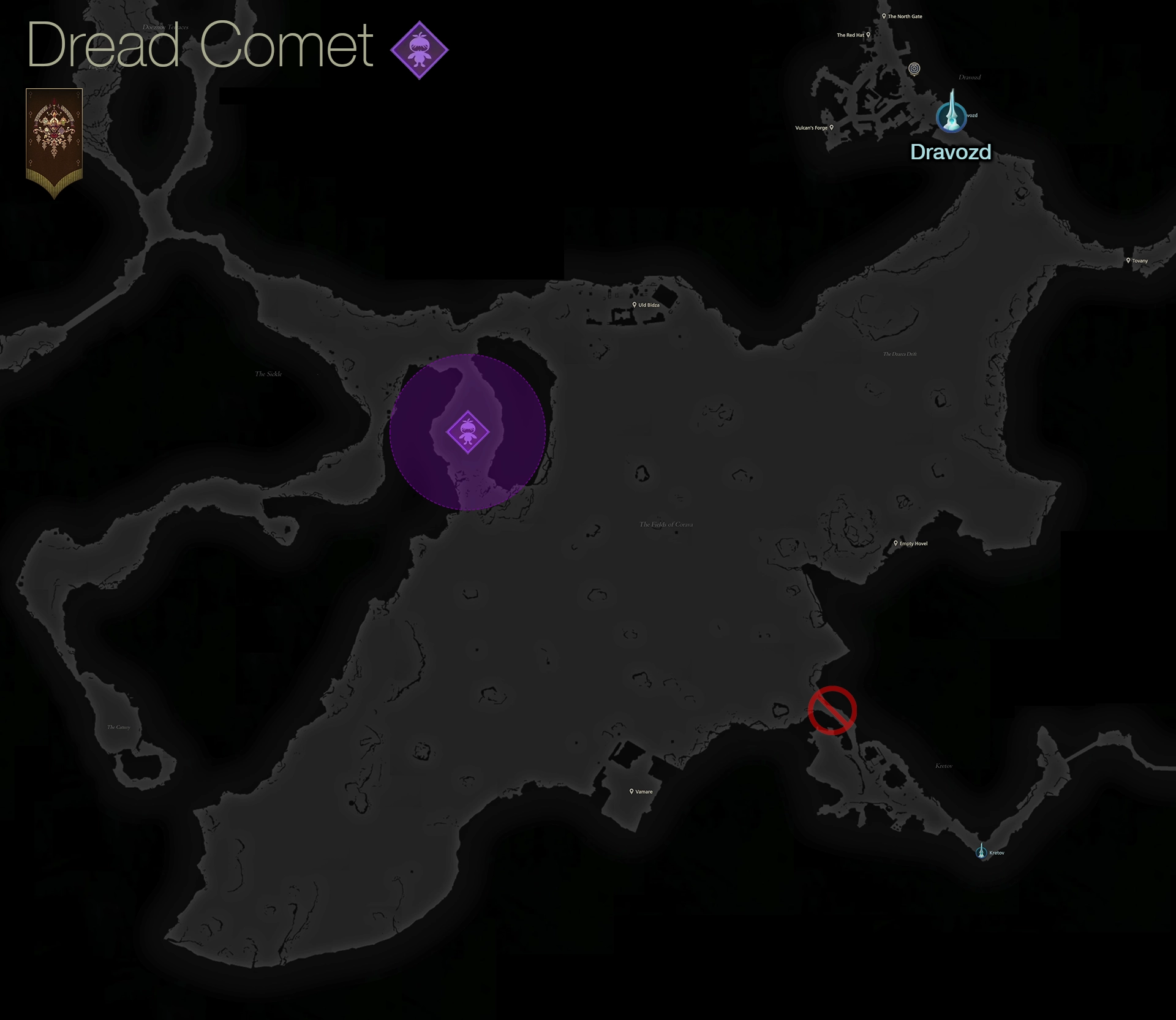 Dread Comet is hanging out in an open area between two cliff walls in an area called “The Sickle” south of Dalimil. Travel to any of the nearby Obelisks (The Jaw, The Dalimil Inn, or Dravozd) and then head to the area indicated on the map below: