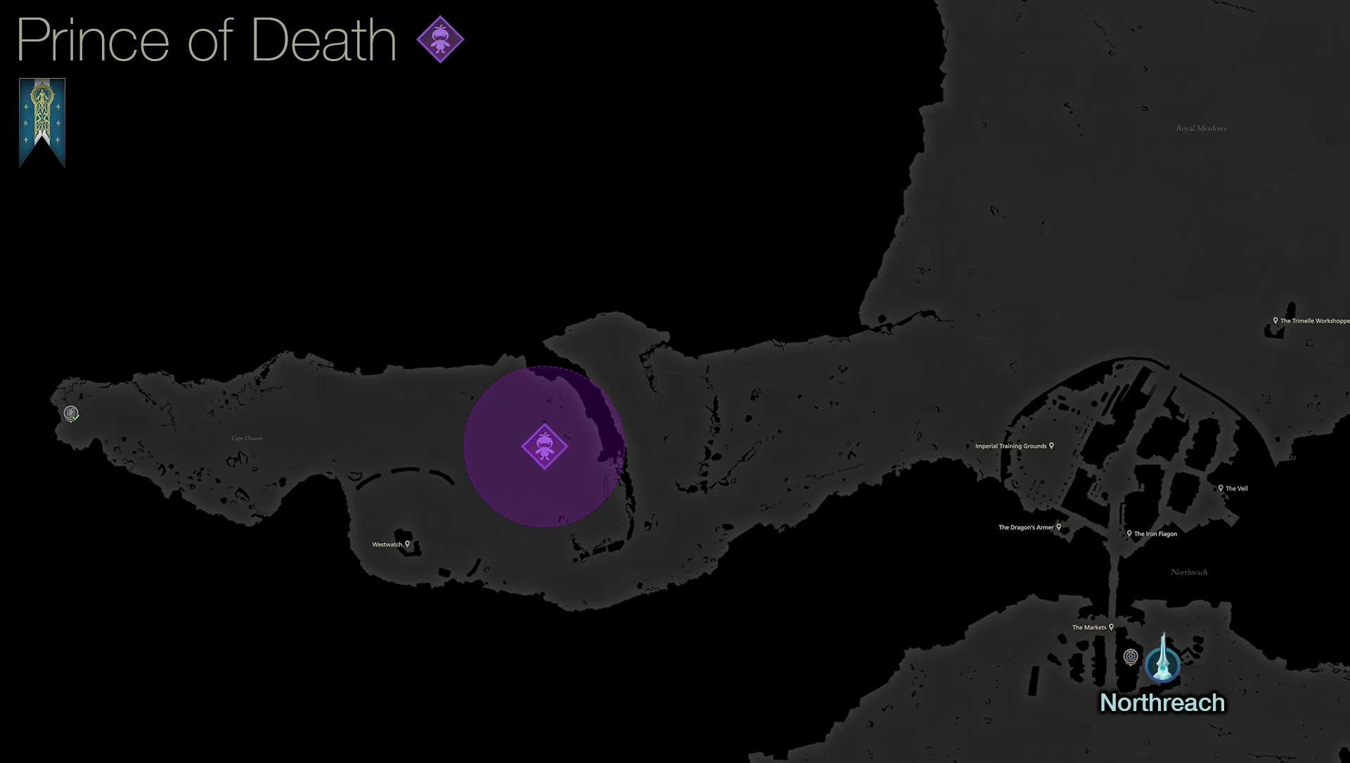 The Prince of Death is located just northeast of Westwatch in the Royal Meadows outside of Northreach. Travel to the Northreach Obelisk and exit through the north side of town.