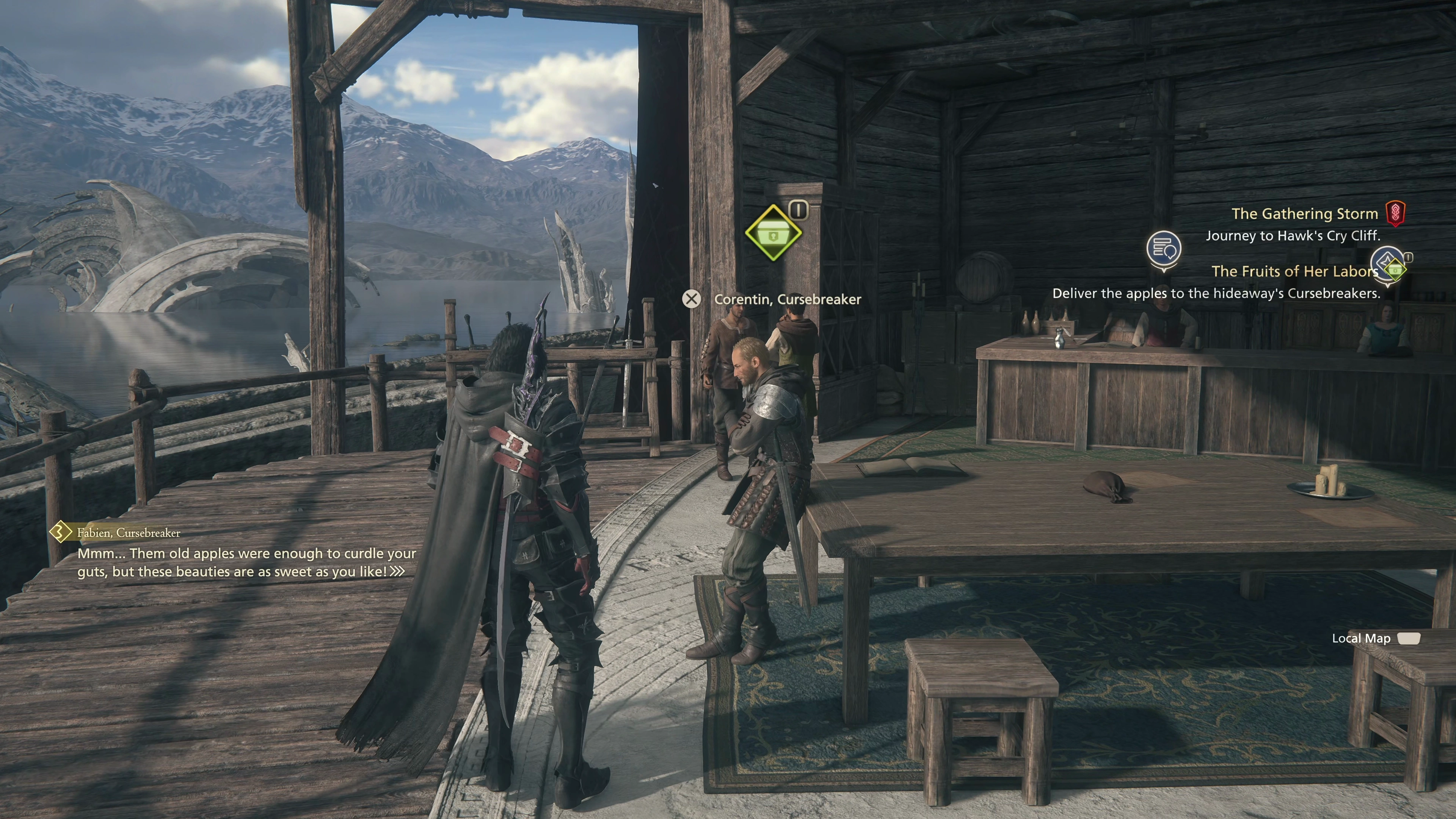This is a straightforward delivery quest. Take the Martelle Apples to Fabien, the Cursebreaker, in the mess, and then speak to Corentin over near the table. Return to Cormac to complete the quest.