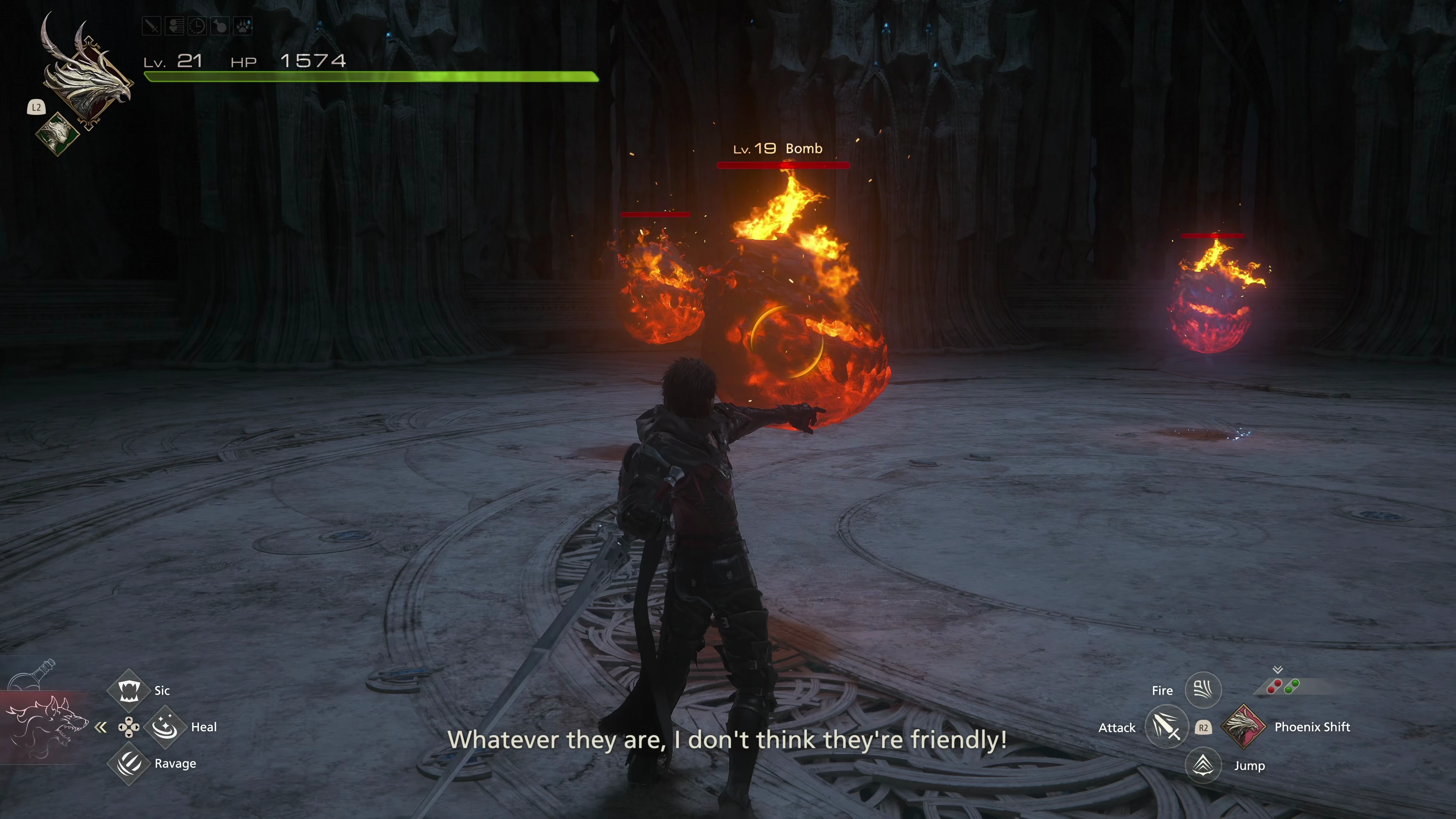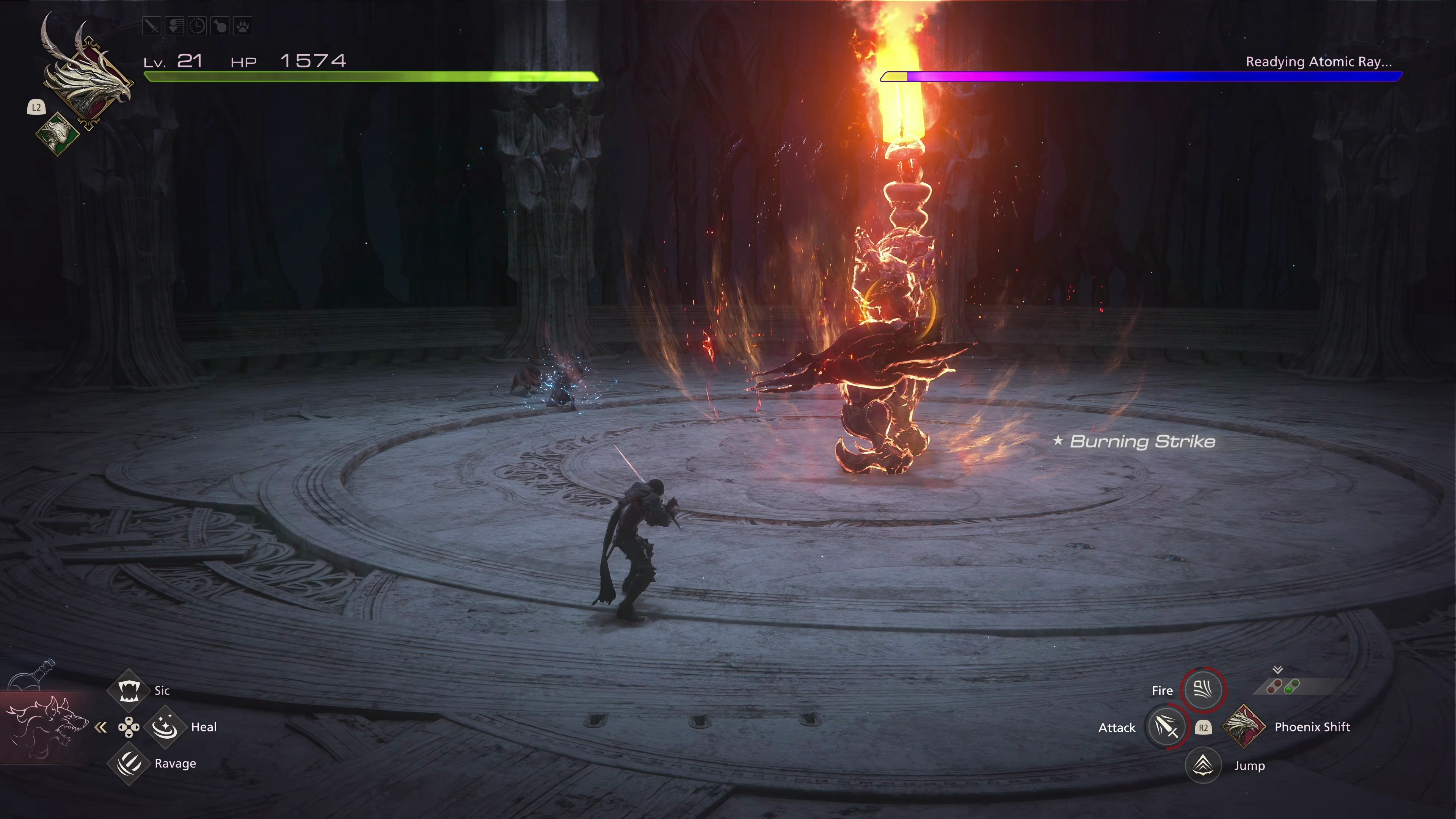 IThis is Infernal Eikon’s most annoying attack. While it’s at a range, its left hand will glow with flames, and it will launch a smattering of fire blobs in a line towards Clive. They are very difficult to dodge because successfully pressing the PlayStation R1 Button button when they hit may land you in one of the other blobs on the right or left. Instead, use Phoenix Shift to jump forward quickly, and you can dodge them much more easily.