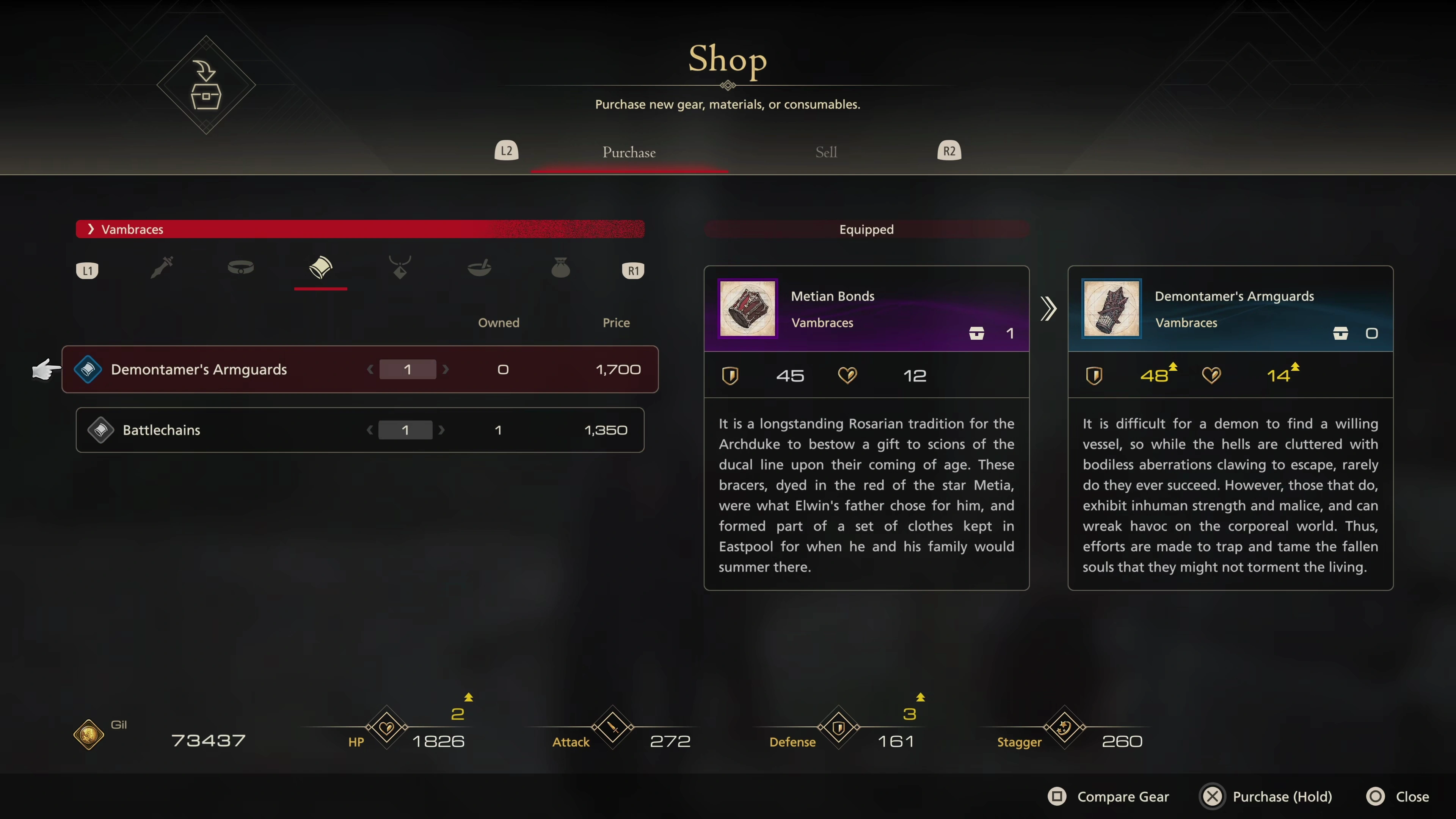 Speak to the “Guardian Quartermaster” in this area, and you can now buy the Demontamer’s Armguards that should have been in one of those treasure coffers from earlier. Afterwards, exit Lazarus and hop on your