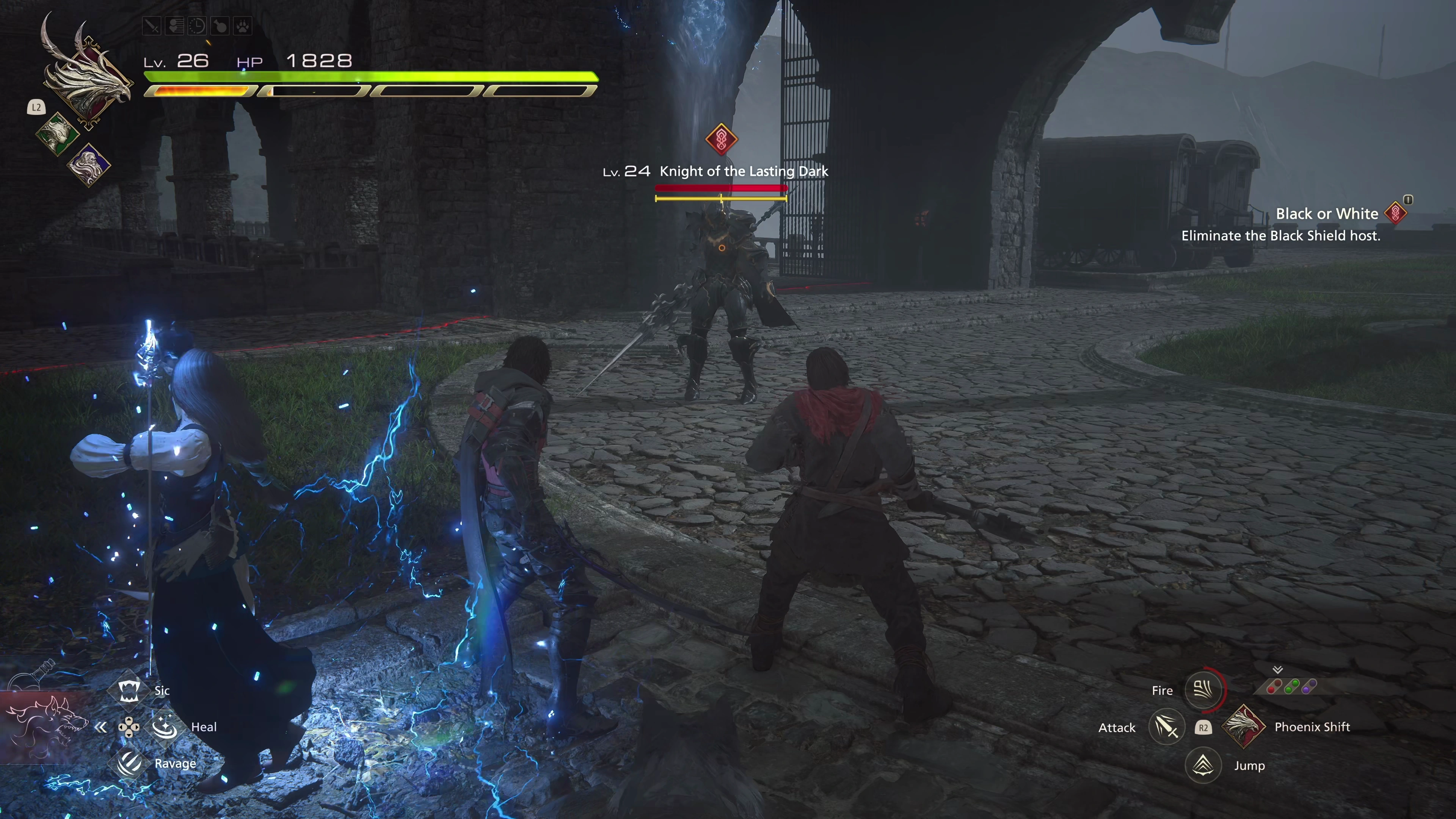 Walk down towards the center of town and make sure you still have your multi-target Eikonic Ability Set activated. Defeat the group of Lazarus Bandits, focusing on the magic spellcasters first.