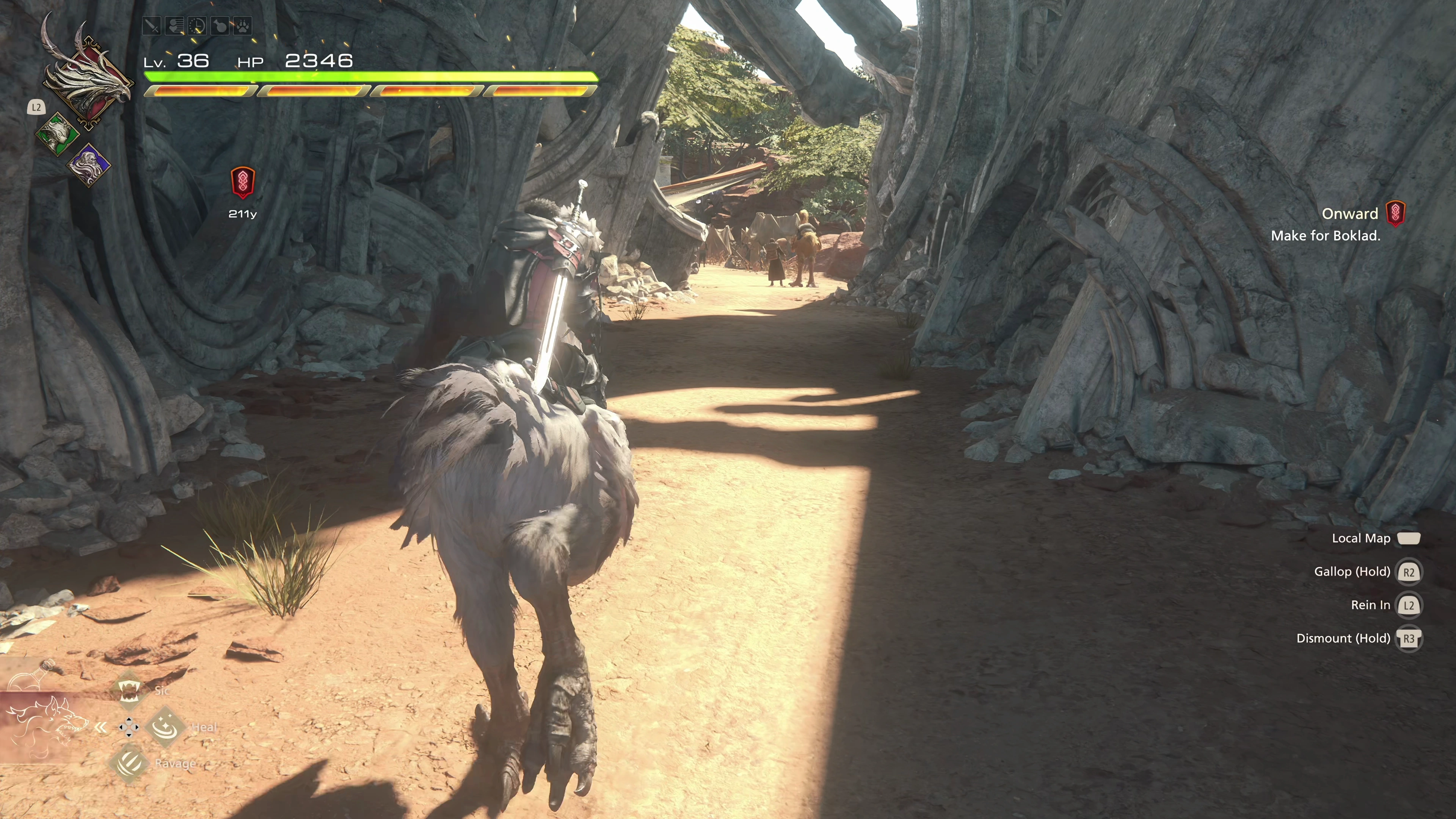 This quest takes us in the exact direction that we were already headed, so it only makes sense to complete it along the way. Jump back onto your Chocobo and continue along the pathway through the ruins. A group of Fallen Hunters will activate as you go through the ruins; you can either defeat them or run past them, if you’re quick enough.