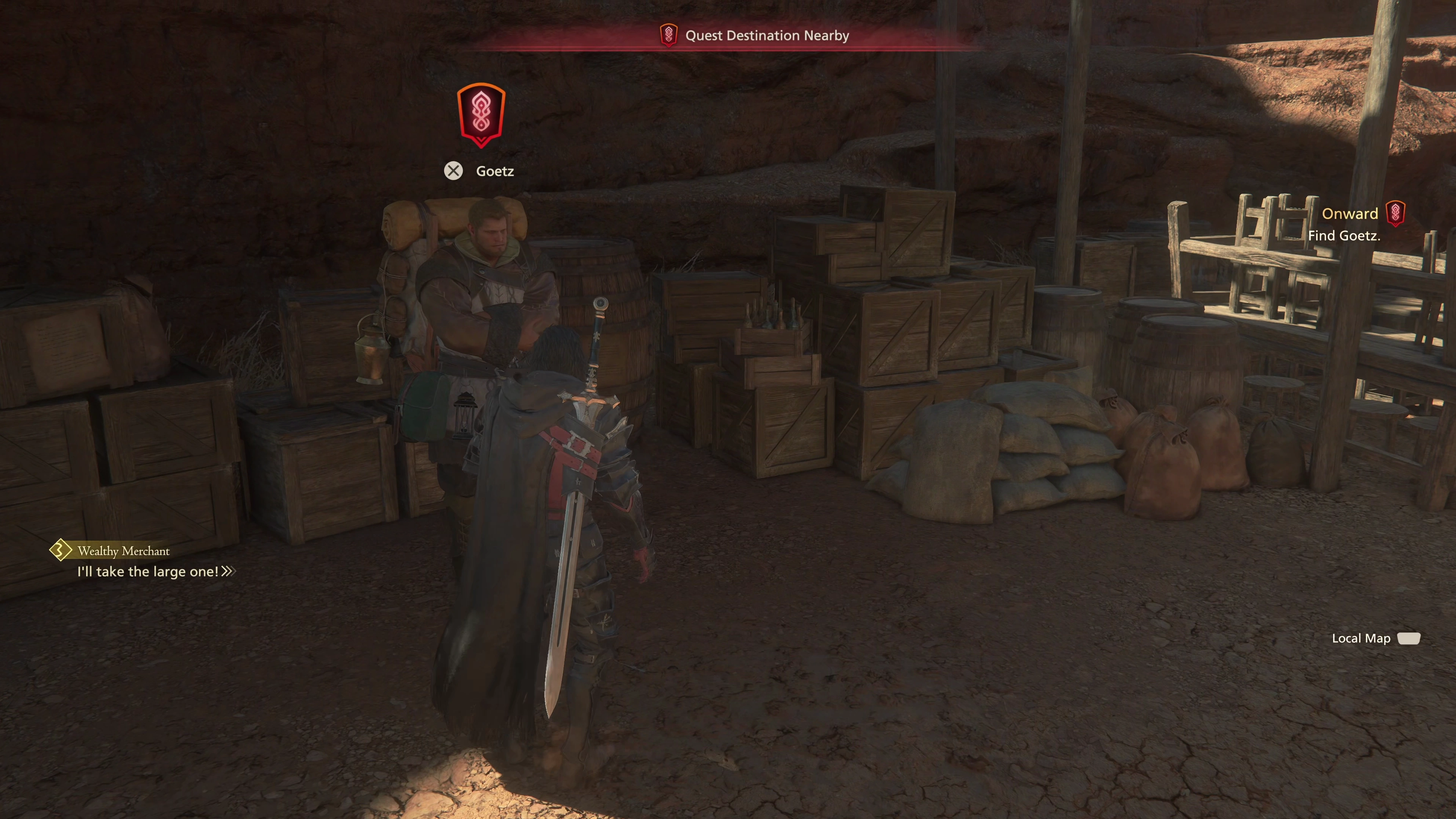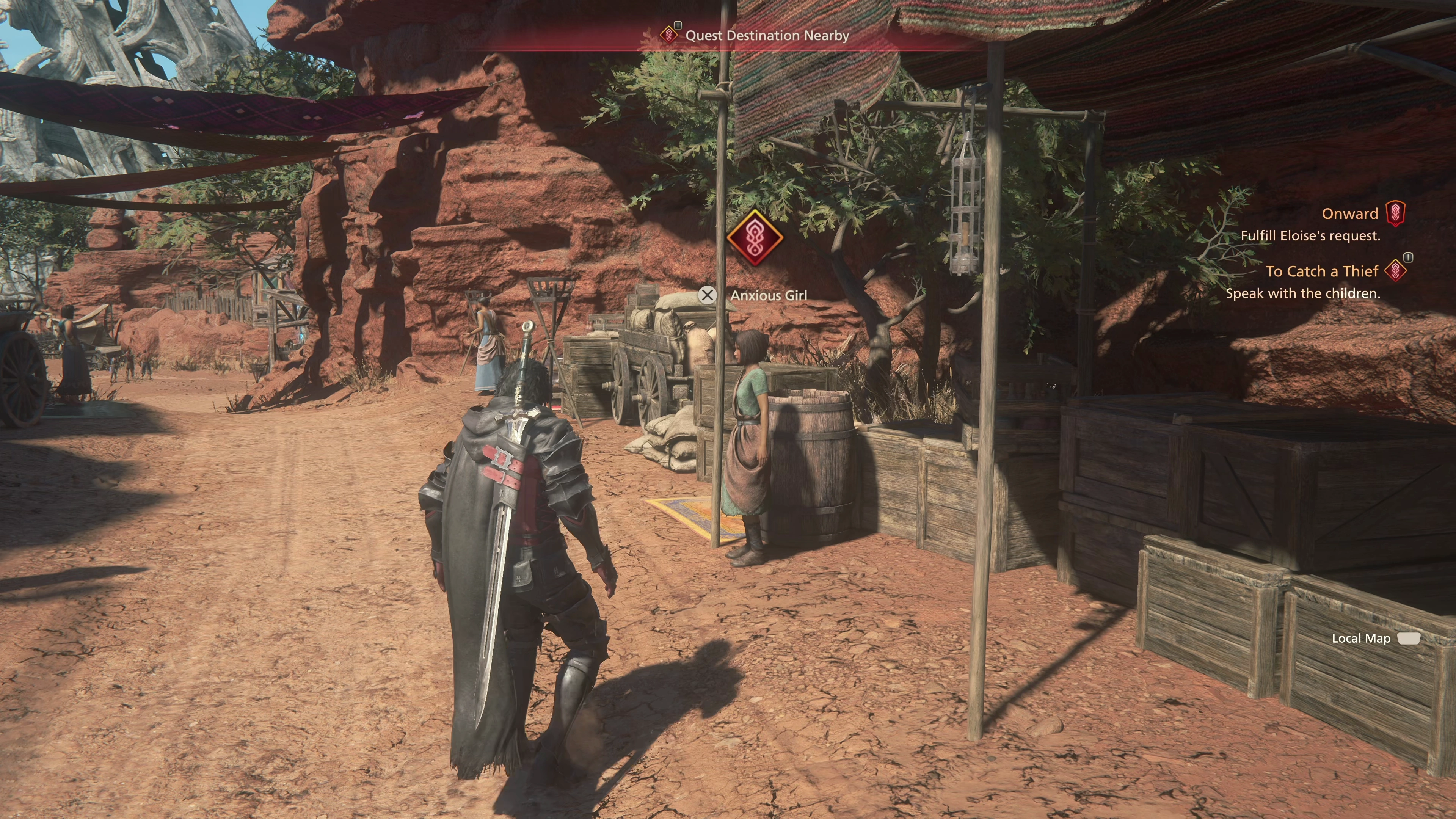 Run towards the Main Scenario Quest Marker for another cutscene to trigger. Clive, Jill, and all of the other travelers will be prevented from traveling to Twinside without a pass. Locate Goetz in the markets and talk to him.