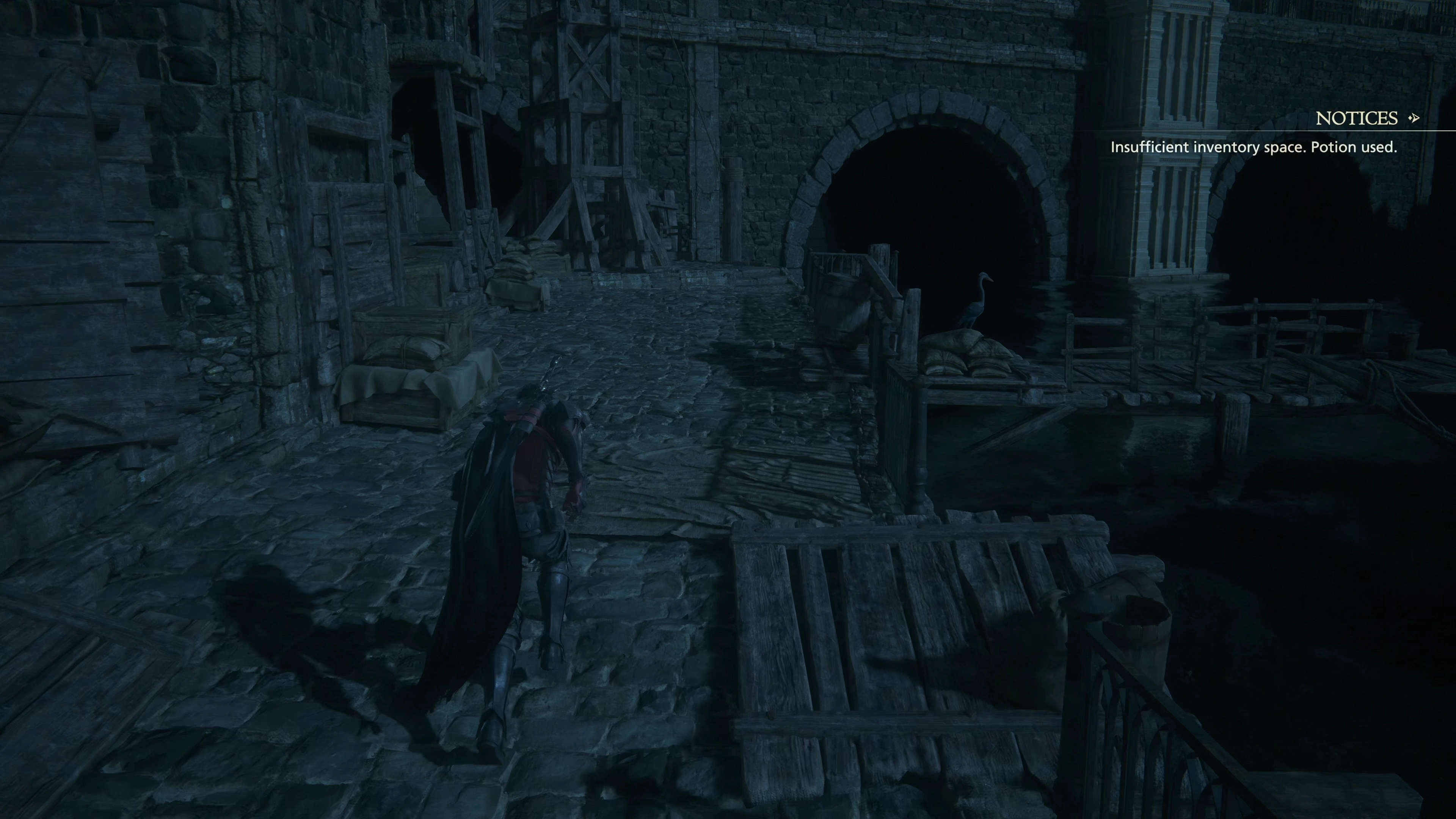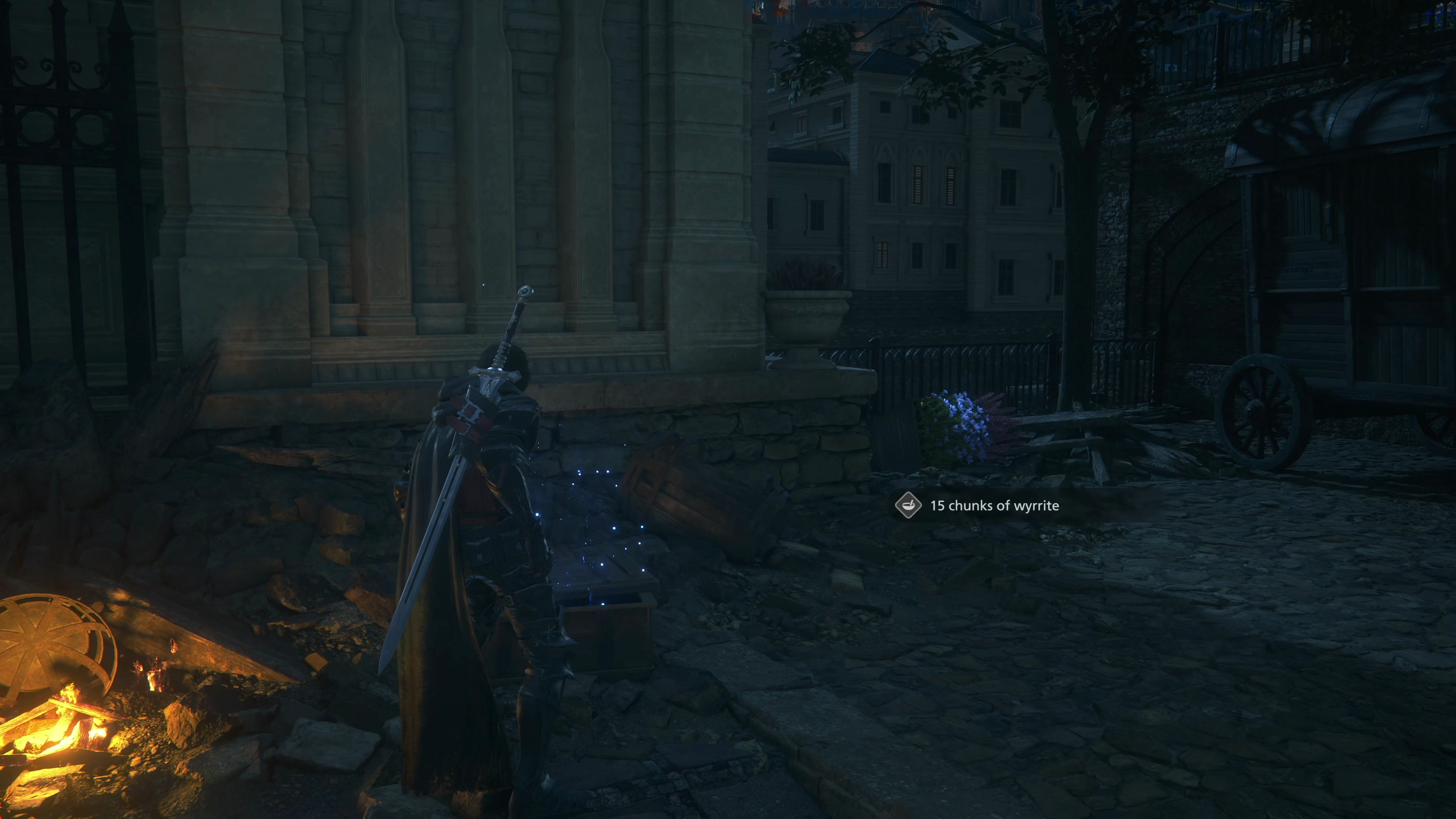 There is a treasure coffer at the base of the right side of the large archway that contains fifteen chunks of Wyrrite. Head under the knocked-down archway and down into the lower sewer levels. You’ll have to defeat some “Megalocrabs” down here.