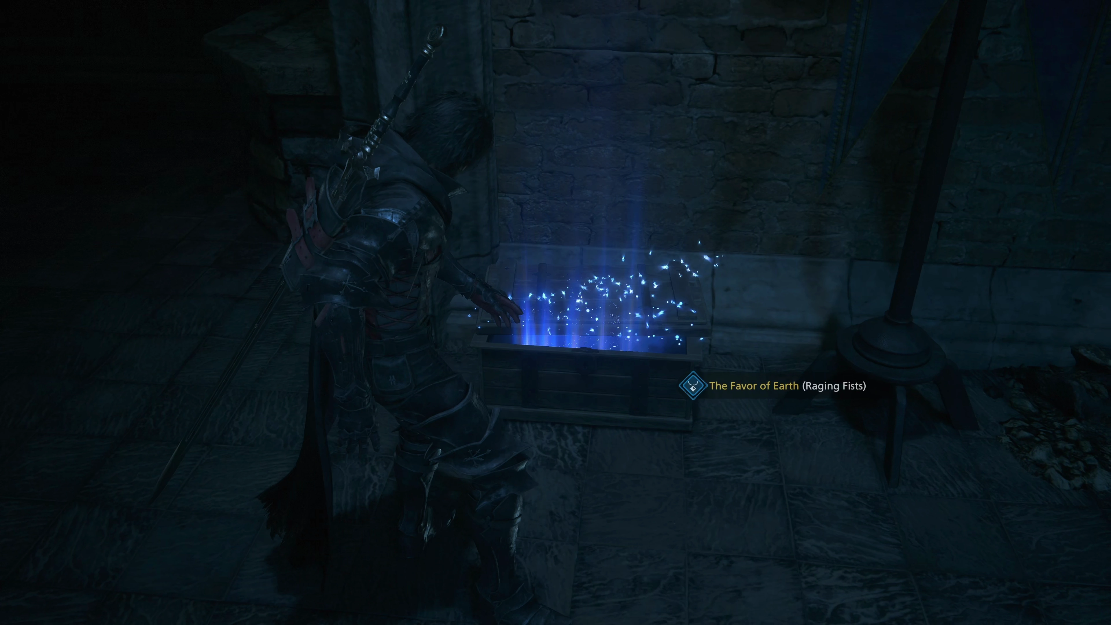 Go through the next two sets of doors at the far end of the walkway when you’re done. Head across the bridge and down the stairs to find two more Dragoon Knights along the stairwell. In the room, at the bottom of the stairs, is a treasure coffer that contains The Favor of Earth (Raging Fists). Don’t accidentally leave it behind!