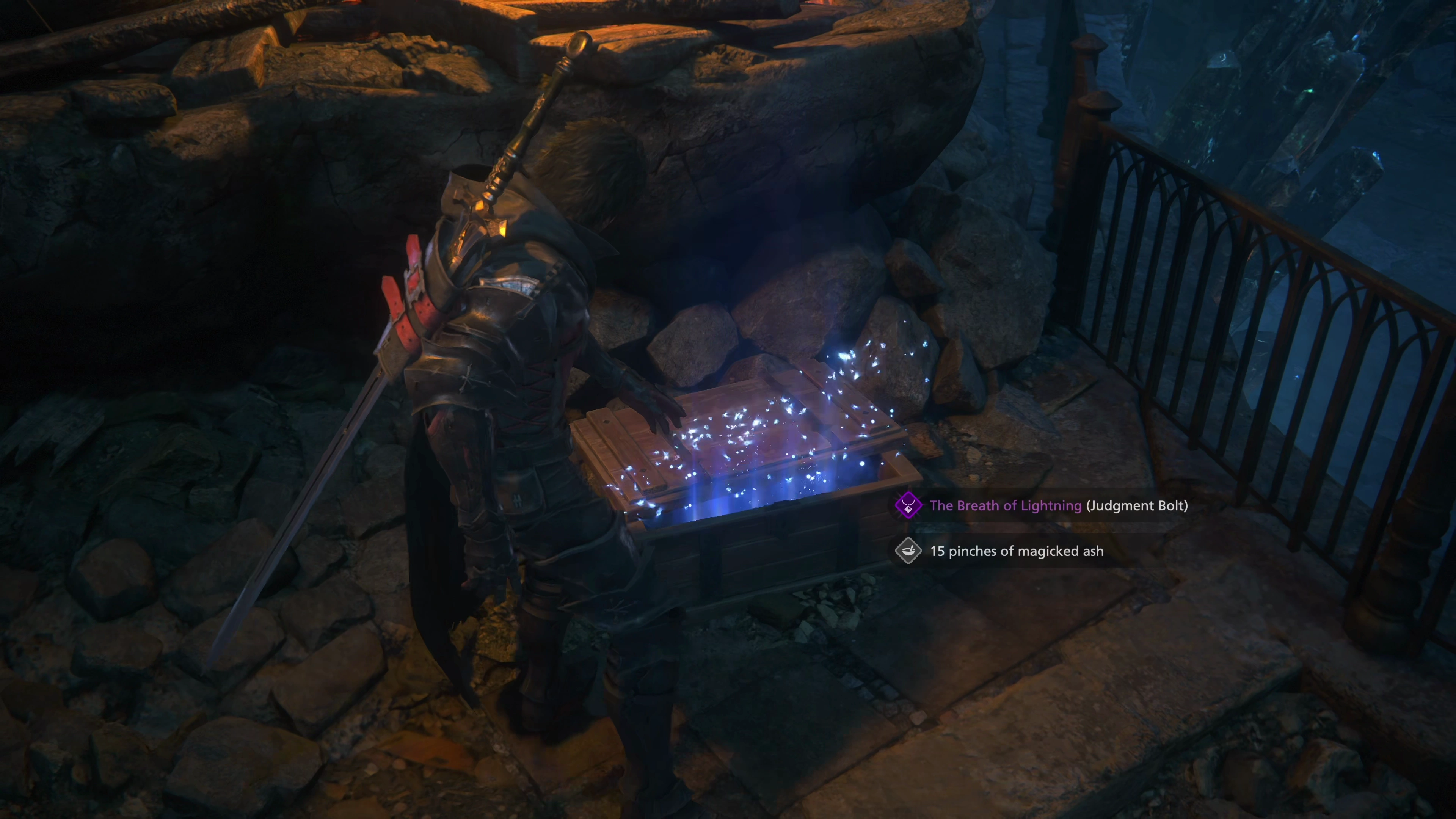 Climb the pallet leaned up against the wall and look to your right to find a treasure coffer that contains The Breath of Lightning (Judgment Bolt) and fifteen pinches of
