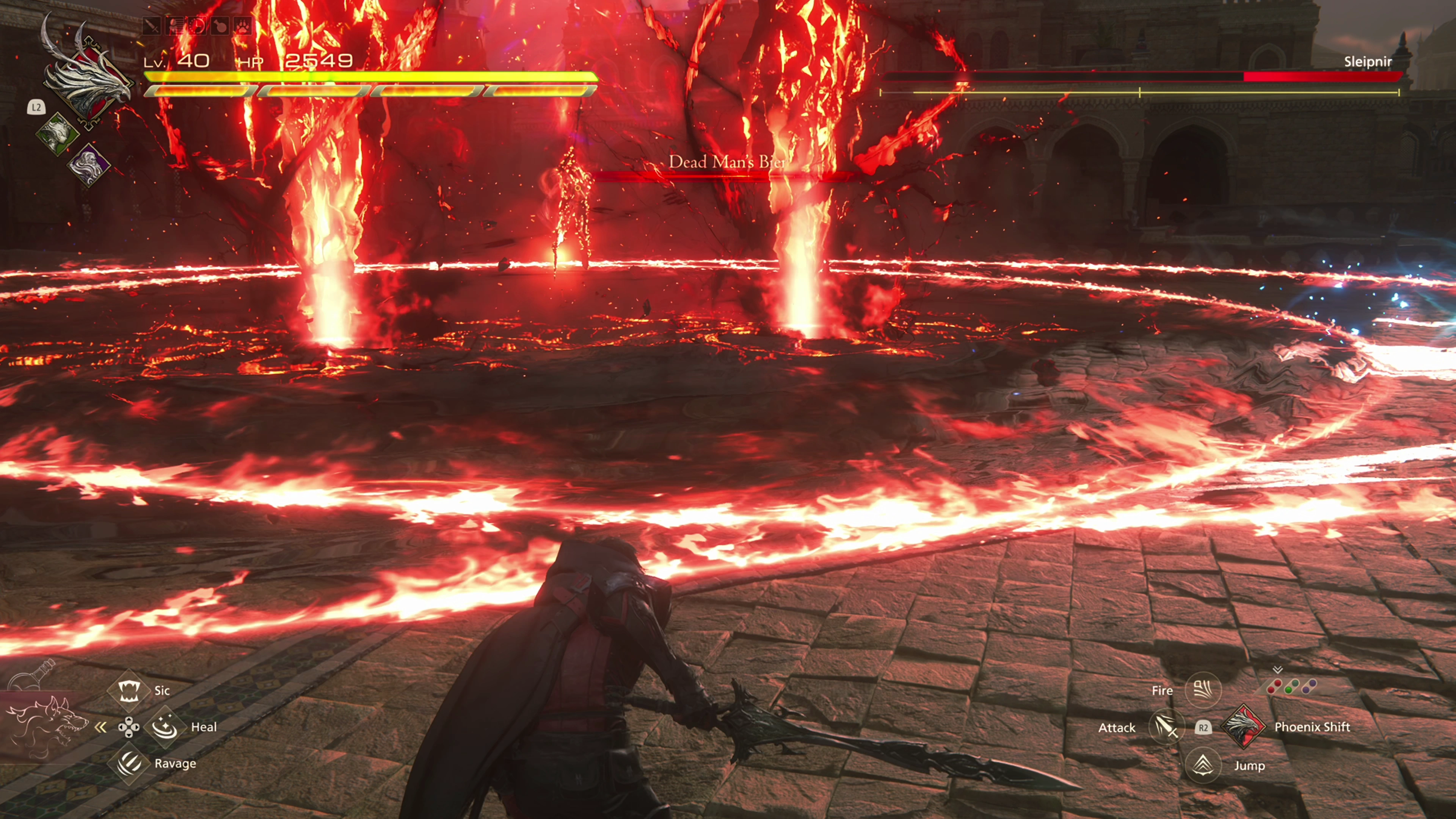 Sleipnir will use this attack after you stagger him a second time. This is the most challenging attack to deal with throughout the fight. It starts with magic blasts falling from the sky. Move out of the areas on the ground that light up bright red. This is easier if you rotate the camera upwards using the . After that, three large beams of light will spawn from the ground. They will eventually explode and, just like Hugo’s “Tumult” attack or